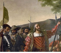 The painting, “Landing of Columbus” on the Islands of Guanahani, West Indies, (renamed San Salvador by Columbus) by John Vanderlyn, completed in 1846, hangs in the rotunda of the US Capitol.  It shows the notary Escobedo standing directly behind the right shoulder of Columbus, which indicates his importance.  Behind the notary is a friar, bearing a crucifix.